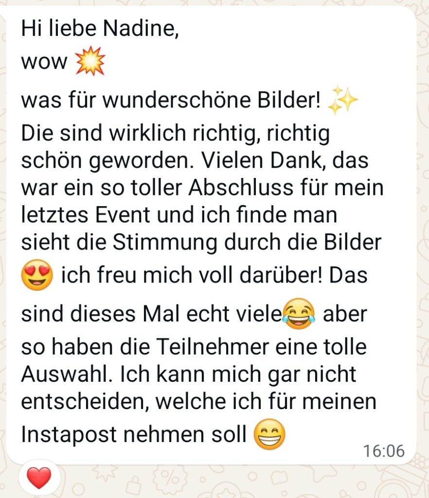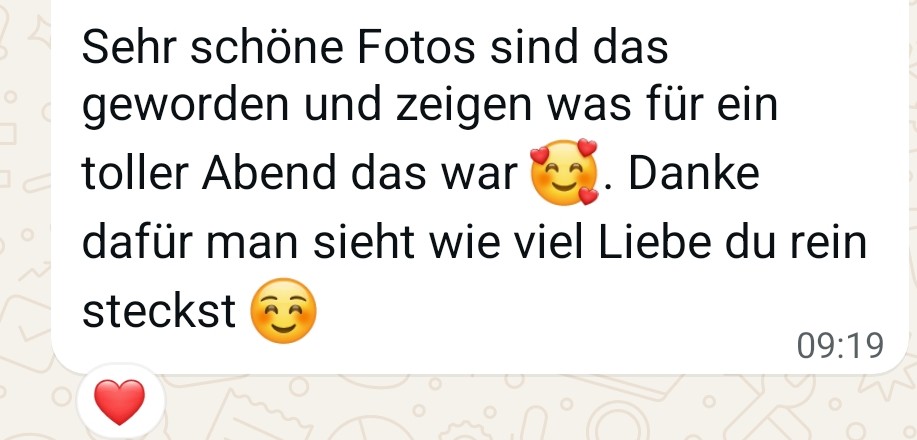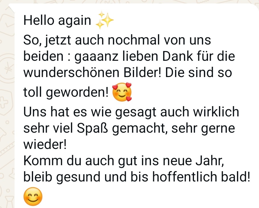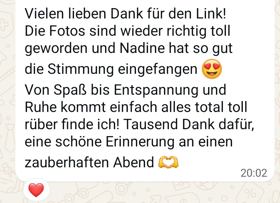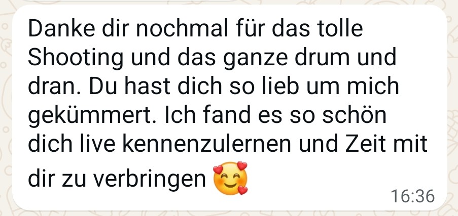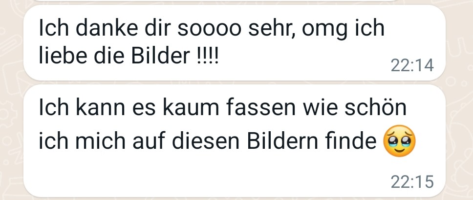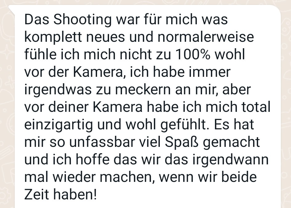 Sobald wir im Kontakt stehen, besprechen wir alles Weitere – zum Beispiel Termin, Zeitpunkt, Location, Outfit oder deine Vorstellungen für das Shooting.